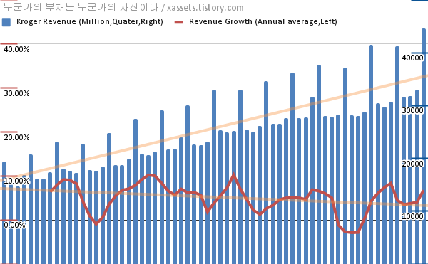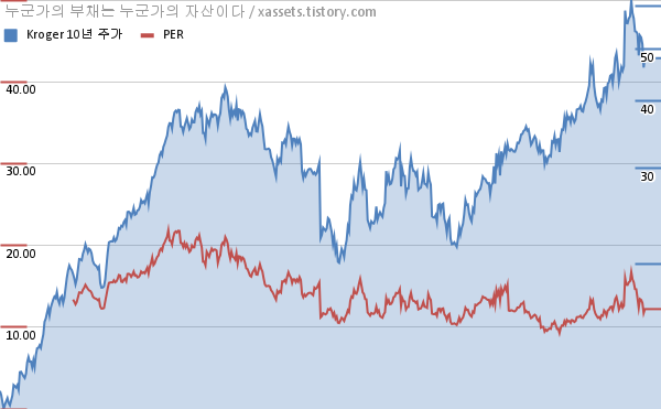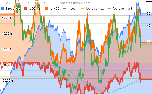- 포스팅일 기준, 크로거의 1, 3, 5, 10년 연평균 주가상승률은 19.23%, 27.60%, 15.37%, 14.82%이다.