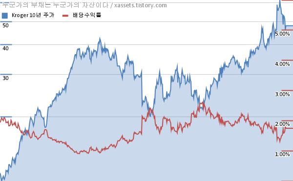 크로거 배당수익률 및 주가 상승률 차트 (2012년~2022년)