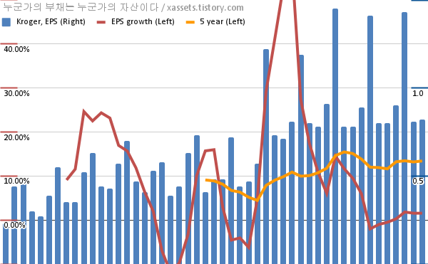 - 포스팅일 기준, 크로거의 1, 5년 연평균 EPS 성장률은 1.54%, 13.42%이다.