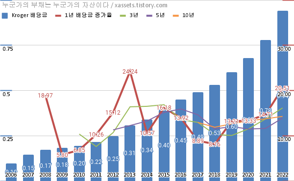 크로거 배당금 및 배당성장률 차트 (2006년~2022년)