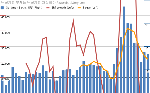 - 포스팅일 기준, 골드만삭스의 1, 5년 연평균 EPS 성장률은 -41.78%, 11.78%이다.