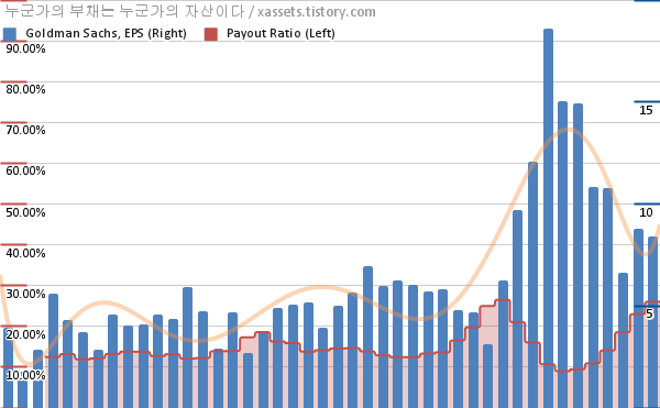 골드만삭스 EPS 성장률, 배당성향 차트 (2012년~2022년)