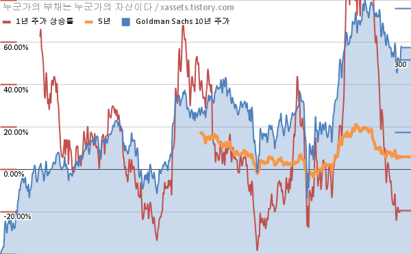 - 포스팅일 기준, 골드만삭스의 1, 3, 5, 10년 연평균 주가상승률은 -19.44%, 11.23%, 5.94%, 11.20%이다.