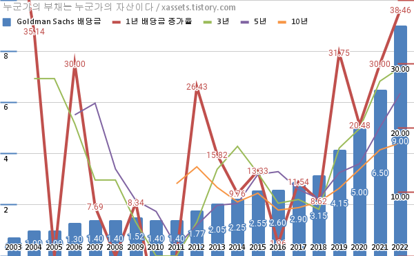 골드만삭스 배당금 및 배당성장률 차트 (2003년~2022년)
