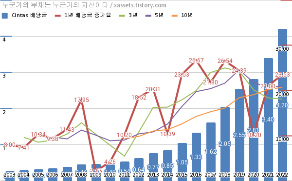 신타스 배당금 및 배당성장률 차트 (2003년~2022년)