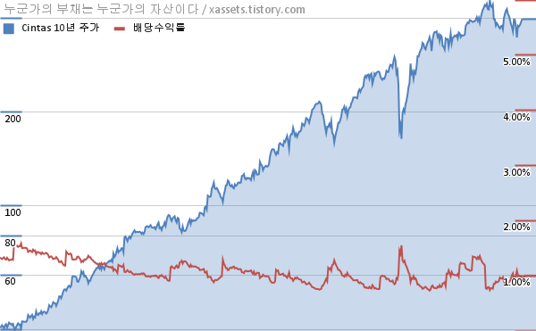 신타스 배당수익률 및 주가 상승률 차트 (2012년~2022년)