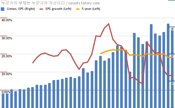 - 신타스의 PER은 상당히 높은 편이면서도 그 높이를 꽤 장기간 유지하고 있는 것이 특징이다. 어지간한 IT 성장주보다 더 성장주 같은 느낌이다. 물론 실적 성장이 꾸준해서 거품이 낀 느낌은 아니다. 물론 그래도 절대치가 높기는 하다.