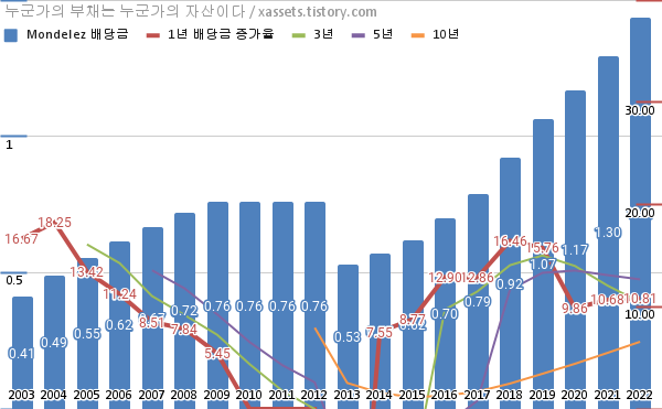 몬델리즈 배당금 및 배당성장률 차트 (2003년~2022년)