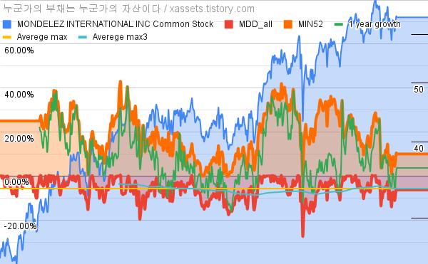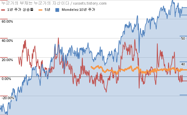 - 포스팅일 기준, 몬델리즈의 1, 3, 5, 10년 연평균 주가상승률은 1.49%, 6.09%, 8.11%, 9.13%이다.