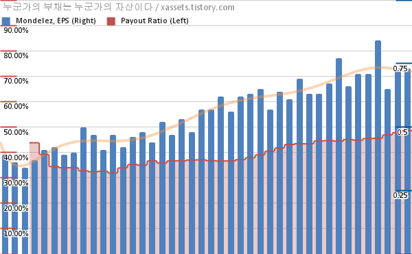 몬델리즈 EPS 성장률, 배당성향 차트 (2012년~2022년)