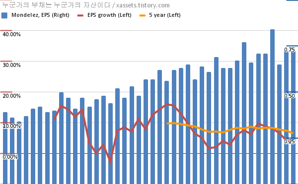 - 포스팅일 기준, 몬델리즈의 1, 5년 연평균 EPS 성장률은 3.51%, 6.53%이다.