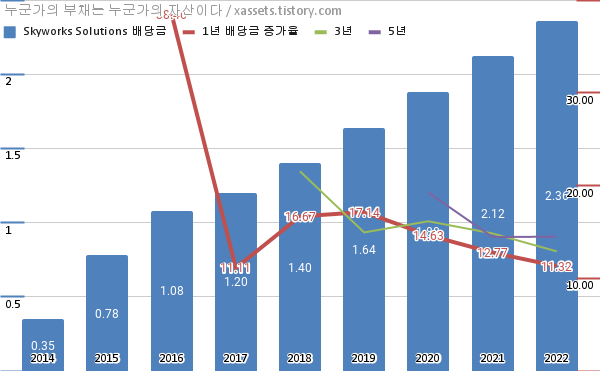 - 스카이웍스 솔루션스의 2022년 기준 1, 3, 5년 연평균 배당성장률은 11.32%, 12.90%, 14.48%이다.