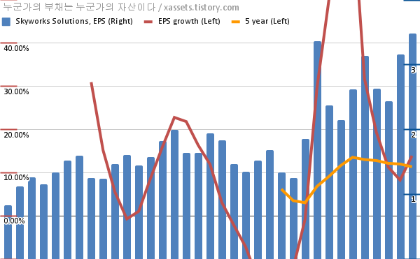 - 포스팅일 기준, 스카이웍스 솔루션스의 1, 5년 연평균 EPS 성장률은 13.91%, 11.35%이다.