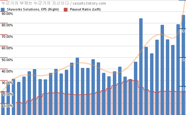 스카이웍스 솔루션스 EPS 성장률, 배당성향 차트 (2014년~2022년)