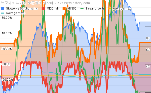 - Skyworks Solutions Inc의 10년 평균 MDD는 -17.75%고, 52주 최저가 대비 평균 상승률은 53.80%다.