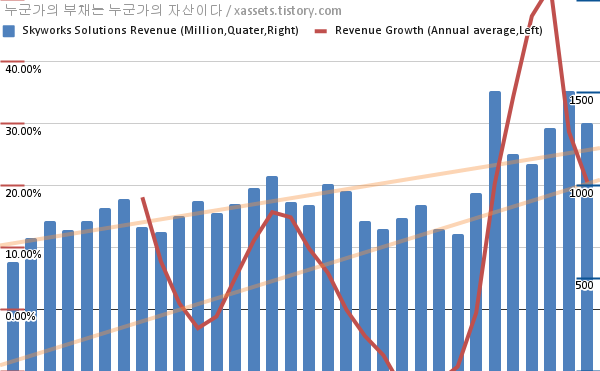 스카이웍스 솔루션스 매출 성장률 차트 (2014년~2022년)
