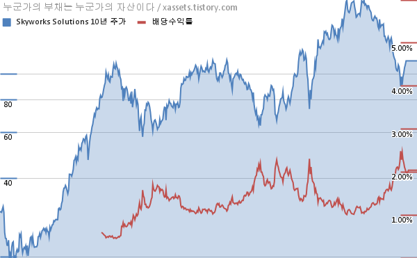 스카이웍스 솔루션스 배당수익률 및 주가 상승률 차트 (2012년~2022년)