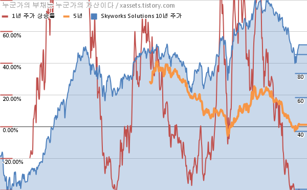 - 포스팅일 기준, 스카이웍스 솔루션스의 1, 3, 5, 10년 연평균 주가상승률은 -39.44%, 13.27%, 1.77%, 14.22%이다.