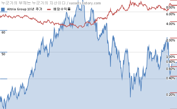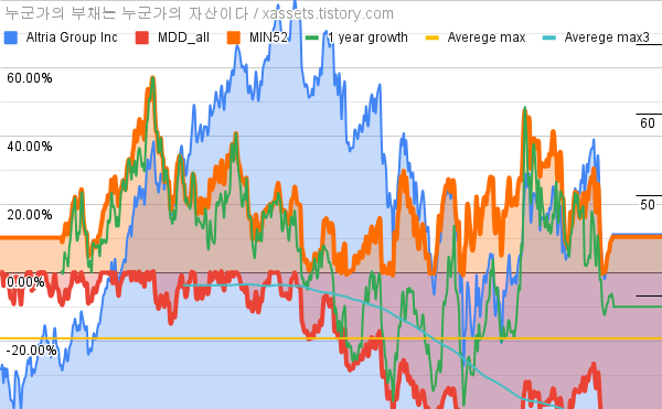 - Altria Group Inc의 10년 평균 MDD는 -19.25%고, 52주 최저가 대비 평균 상승률은 19.44%다.