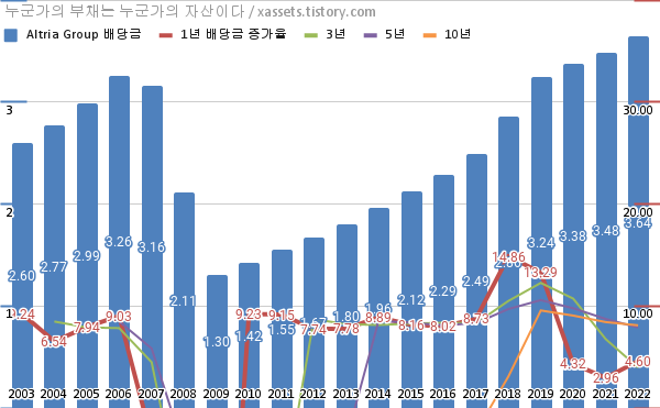 알트리아 그룹 배당금 및 배당성장률 차트 (2003년~2022년)