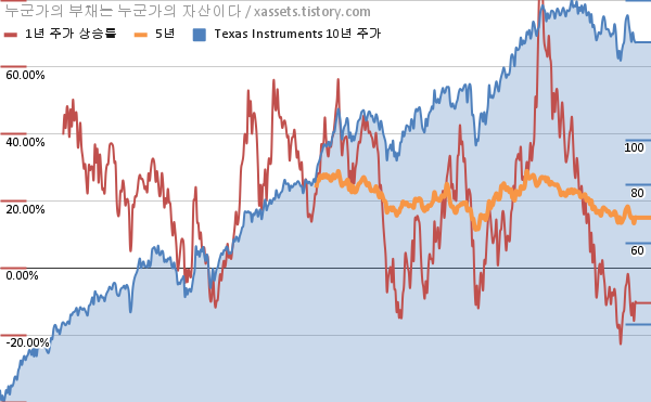 - 포스팅일 기준, 텍사스 인스트루먼트의 1, 3, 5, 10년 연평균 주가상승률은 -10.44%, 9.62%, 15.01%, 19.40%이다.