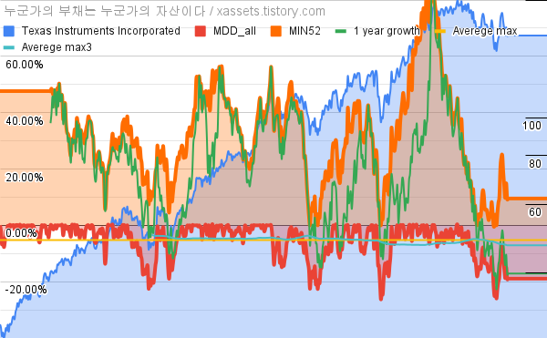 - Texas Instruments Incorporated의 10년 평균 MDD는 -5.21%고, 52주 최저가 대비 평균 상승률은 32.17%다.