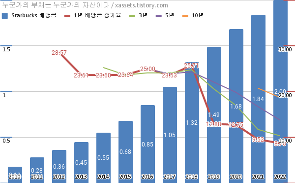 스타벅스 배당금 및 배당성장률 차트 (2010년~2022년)