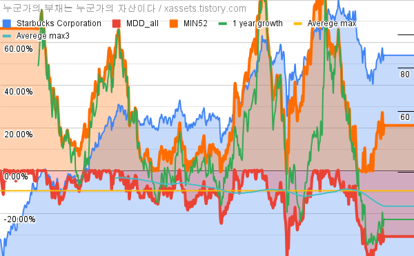 - Starbucks Corporation의 10년 평균 MDD는 -9.39%고, 52주 최저가 대비 평균 상승률은 29.97%다.