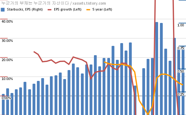 - 포스팅일 기준, 스타벅스의 1, 5년 연평균 EPS 성장률은 -13.43%, 5.68%이다.
