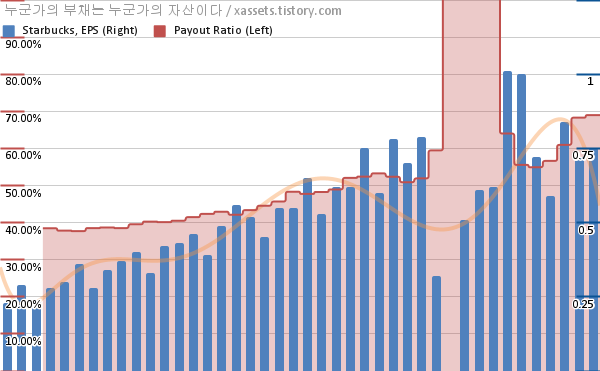 스타벅스 EPS 성장률, 배당성향 차트 (2012년~2022년)