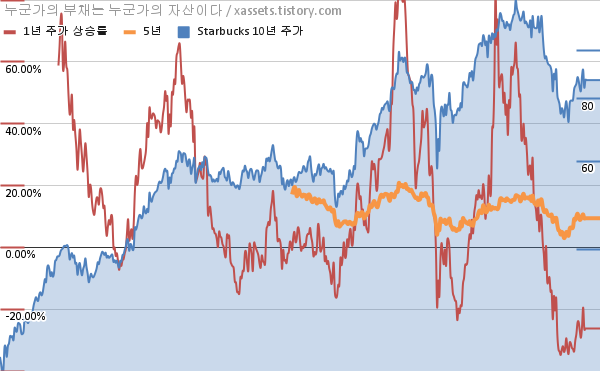- 포스팅일 기준, 스타벅스의 1, 3, 5, 10년 연평균 주가상승률은 -26.24%, -1.61%, 9.40%, 13.20%이다.