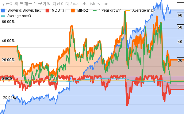 - Brown & Brown, Inc.의 10년 평균 MDD는 -5.09%고, 52주 최저가 대비 평균 상승률은 24.83%다.