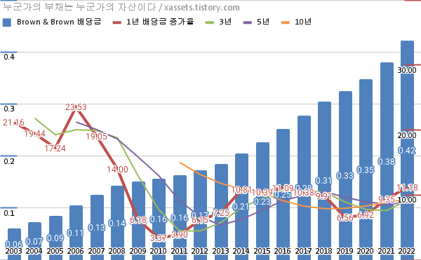 브라운 앤 브라운 배당금 및 배당성장률 차트 (2003년~2022년)