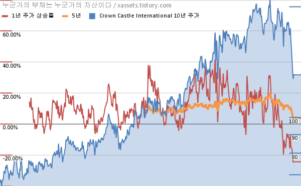 크라운캐슬 인터내셔널 배당수익률 및 주가 상승률 차트 (2012년~2022년)